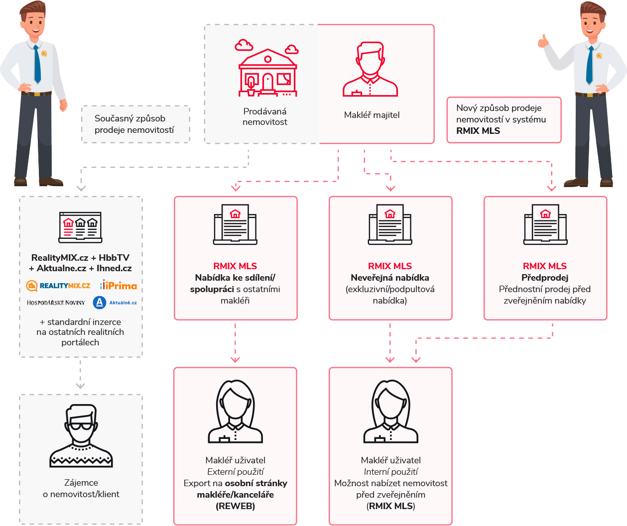 Centrálním prvkem celého systému je softwarové řešení MLS (Multiple Listing Service) na platformě realitního portálu RealityMIX.cz (RMIX MLS). Tato platforma realitním makléřům umožňuje sdílení informací o nemovitostech, jejich prodeji a nákupu. Jinými slovy realitní makléři mohou velmi jednoduše nabídnout své nemovitosti ostatním členům platformy k prodeji, ale zároveň se jim otevírá extrémně široká nabídka nemovitostí ostatních makléřů, kterou mohou snadno využívat při práci s poptávkou u vlastních klientů. Systém tak umožňuje zobrazení zakázek jiných makléřů ze systému na vlastním webu. Makléři je tak mohou svým klientům ukázat na své webové prezentaci. Navíc systém makléře, kteří sdílí své zakázky s ostatními odměňuje.